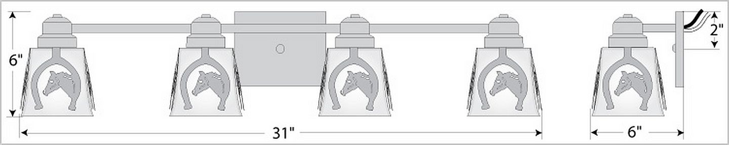 The Woodland Quad Bath Light - Horse Horseshoe features four pieces of square mission style glass and horse designs surrounding the glass. The horse head has hand-cut interior lines which gives each image a unique look. Choice of glass color between Frost Clear and Tea-Stained. This fixture may be hung with bulb pointing up or down. This sophisticated take on traditional rustic lighting will generate a warm atmosphere in any bathroom.