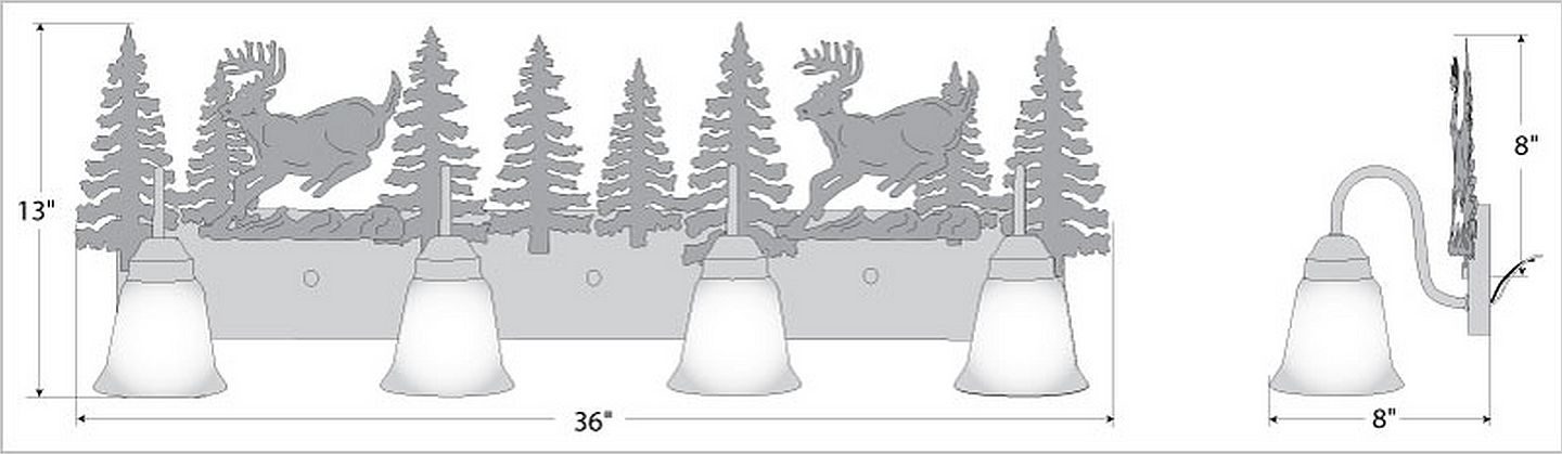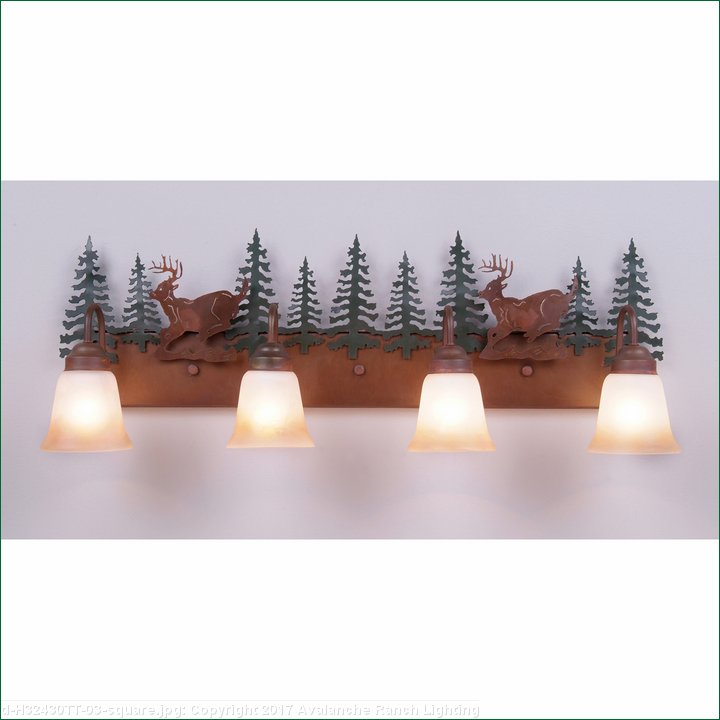 Affordable and pratical bathroom lights make the Wasatch Bathroom Vanity lights one of our best selling series. Offered with a choice of eight different styles and colors of glass globes, this fixture gives abundant light and rustic character to any bathroom. This item is the Wasatch Quad - Mtn Deer and is Pictured in Finish #03 - Cedar Green trees and Rust Patina base.