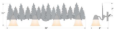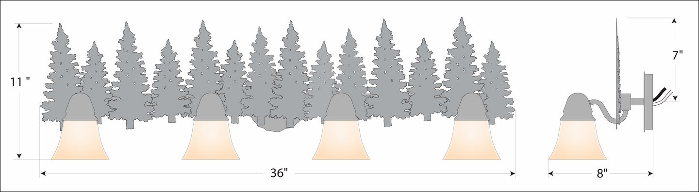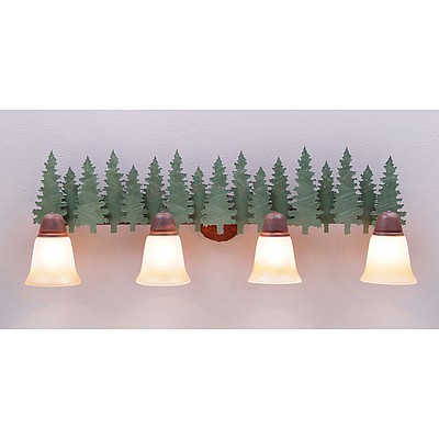 The Lakeside Quad Bath Light - Pine features tree metal art running the whole length of the fixture. There is a choice of six different glass globes, the smallest of which only takes A15 bulb. This rustic bathroom vanity light will add warm lighting and rustic character to any bathroom, hallway or over a kitchen sink. Note: This fixture was redesigned in March 2010.