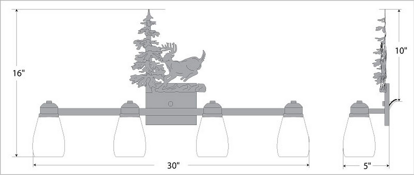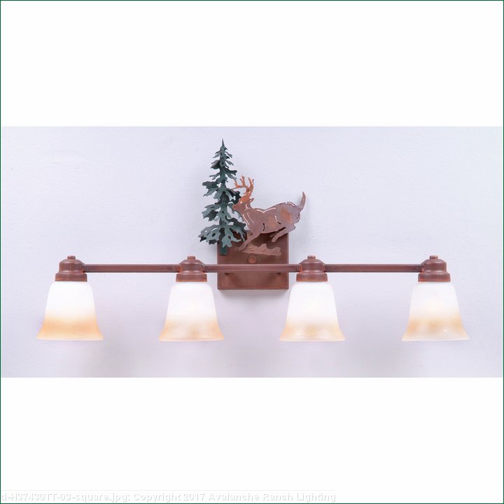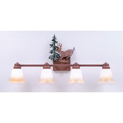 The Parkshire Quad Bath Light - Mtn Deer is a four-light vanity fixture which features three-dimensional metal art images of both a deer and a cedar tree. There are seven different glass globes that fit this bath vanity, so you can pick a style that suits your decorating needs. This light will provide abundant light to any bathroom, whether in a log cabin, or in a traditional home where a eye-catching decor style is desired. Hardwire is standard.