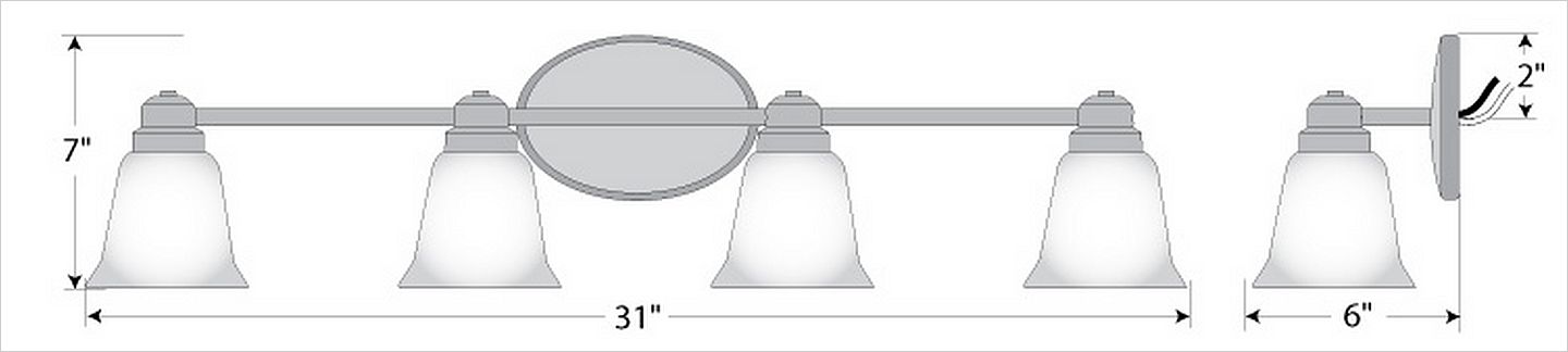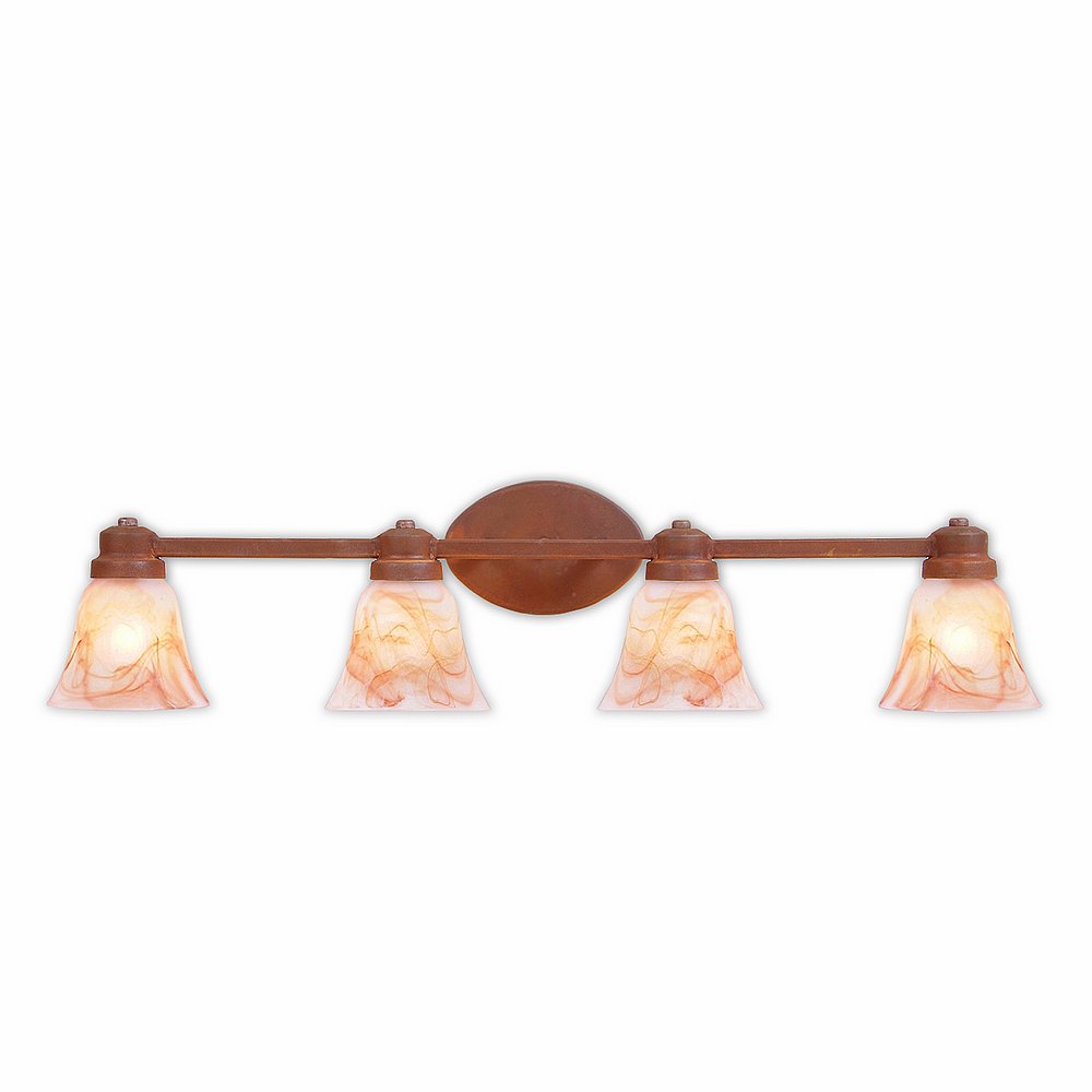 The Sienna Quad Bath Light - Rustic Plain light features glass bells with a choice of seven different colors hanging from cups attached to square tubes. This light is ideal for anyone looking to add warm lighting or rustic character to their bathroom.