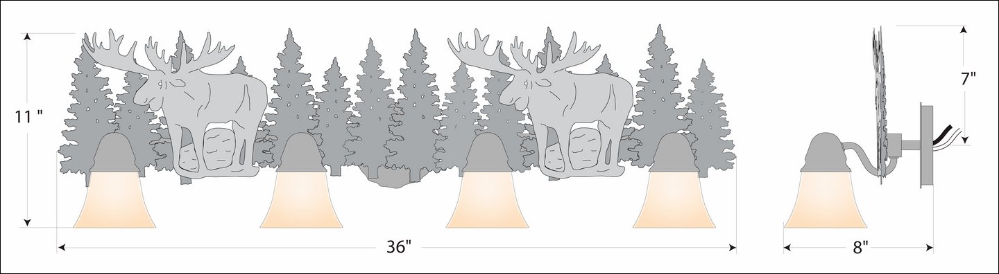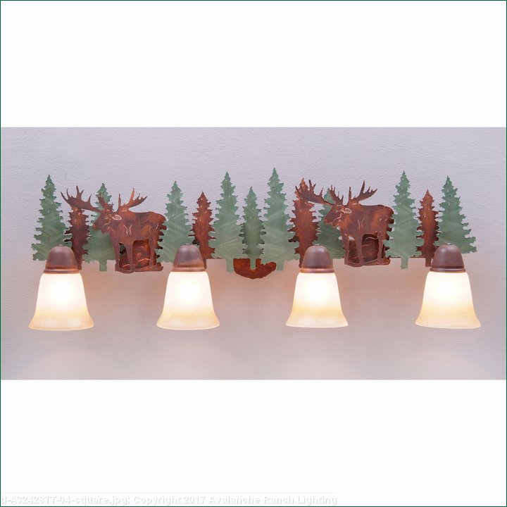 The Lakeside Quad Bath Light - Moose features trees and two of our moose with handcut interior lines. There is a choice of six different glass globes, the smallest of which only takes A15 bulb. This rustic bathroom vanity light will add warm lighting and rustic character to any bathroom, hallway or over a kitchen sink. Note: This fixture was redesigned in March 2010.