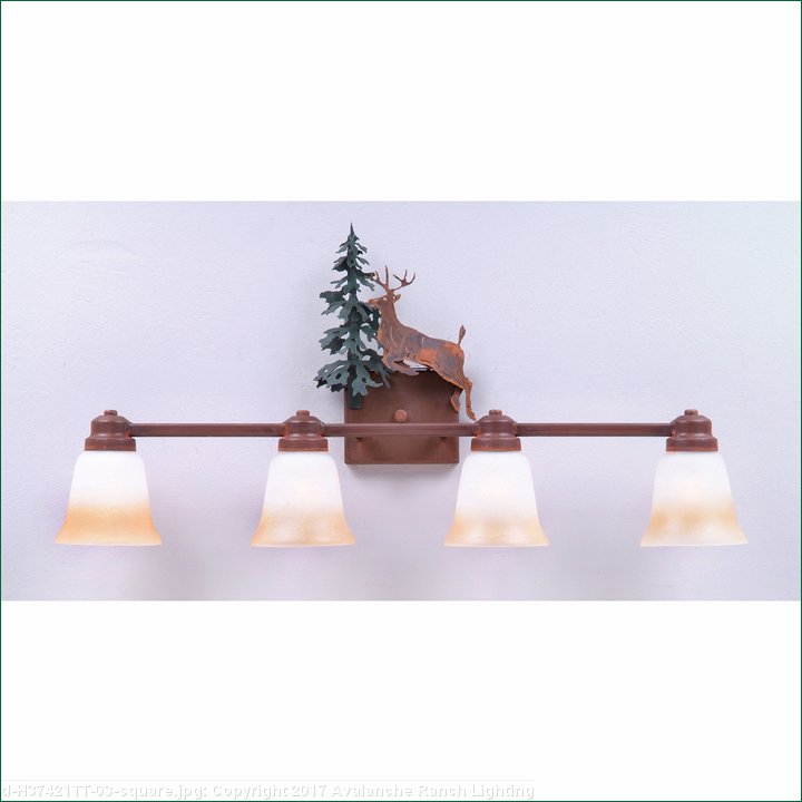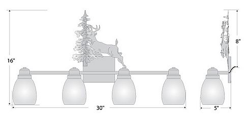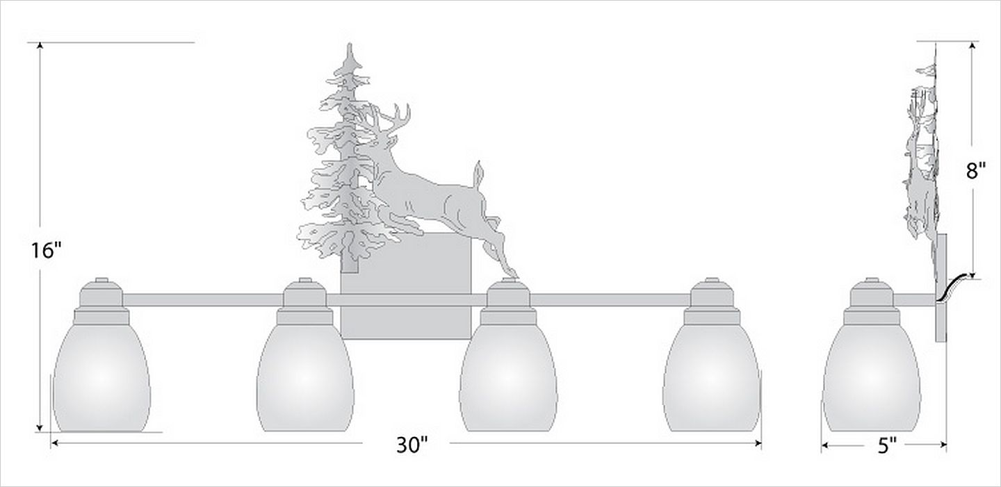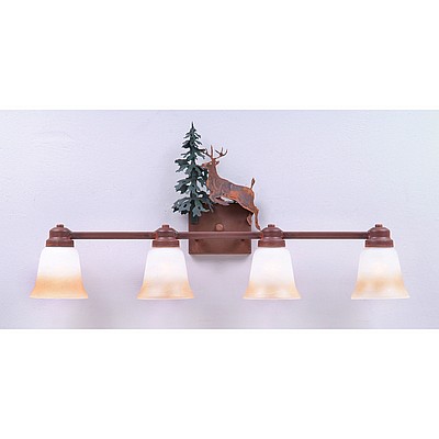 The Parkshire Quad Bath Light - Deer is a four-light vanity fixture which features three-dimensional metal art images of both a deer and a cedar tree. There are seven different glass globes that fit this bath vanity, so you can pick a style that suits your decorating needs. This light will provide abundant light to any bathroom, whether in a log cabin, or in a traditional home where a eye-catching decor style is desired. Hardwire is standard.