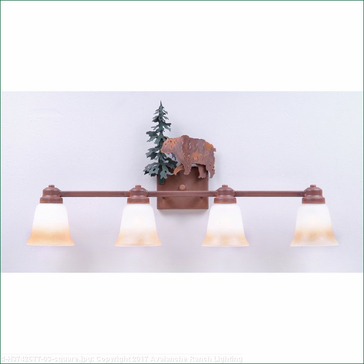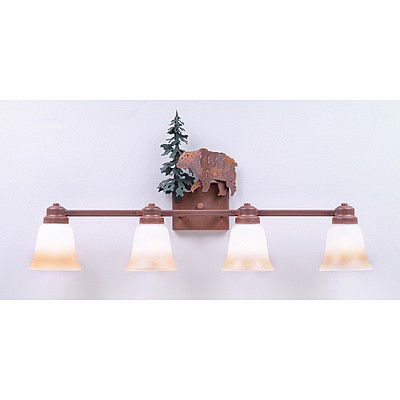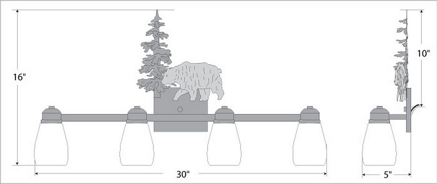 The Parkshire Quad Bath Light - Bear is a four-light vanity fixture which features three-dimensional metal art images of both a bear and a cedar tree. There are seven different glass globes that fit this bath vanity, so you can pick a style that suits your decorating needs. This light will provide abundant light to any bathroom, whether in a log cabin, or in a traditional home where a eye-catching decor style is desired. Hardwire is standard.