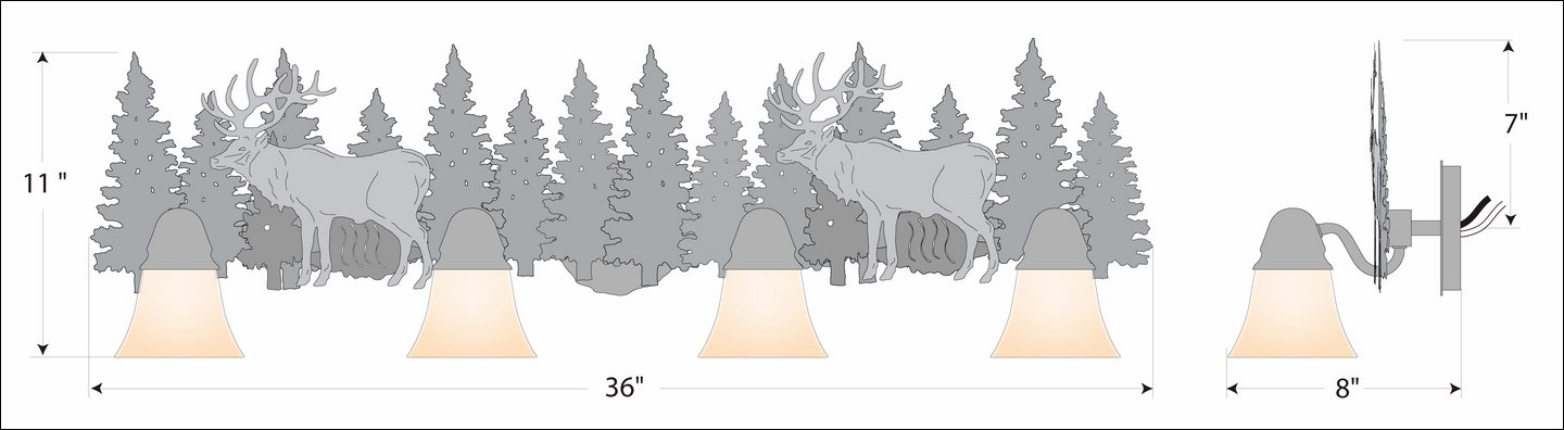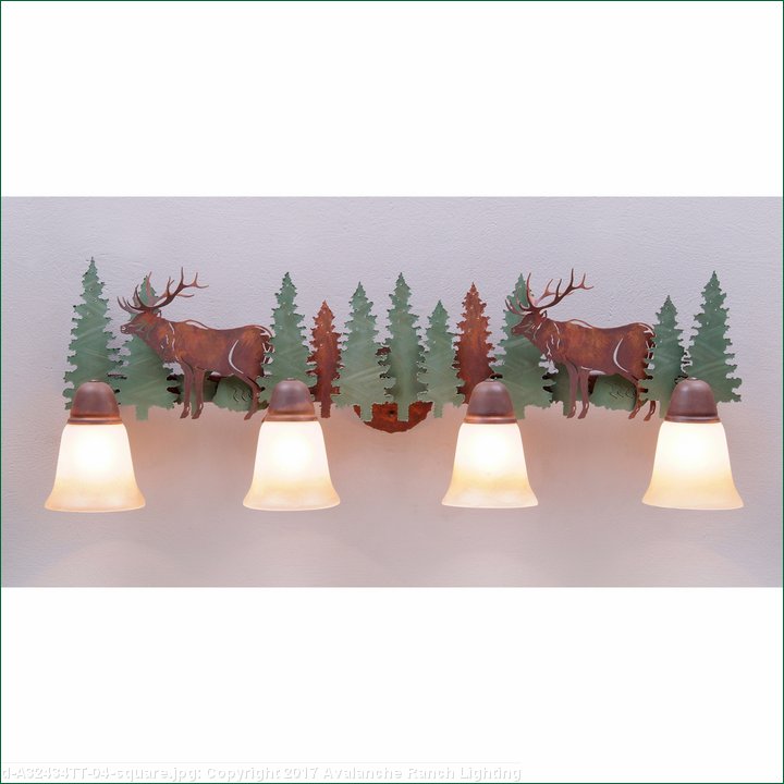 The Lakeside Quad Bath Light - Elk features trees and two of our laser cut elk with three dimensional antlers. There is a choice of six different glass globes, the smallest of which only takes A15 bulb. This rustic bathroom vanity light will add warm lighting and rustic character to any bathroom, hallway or over a kitchen sink. Note: This fixture was redesigned in March 2010.