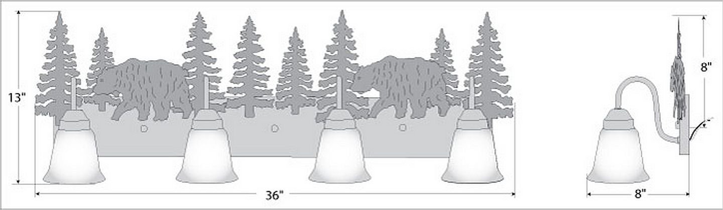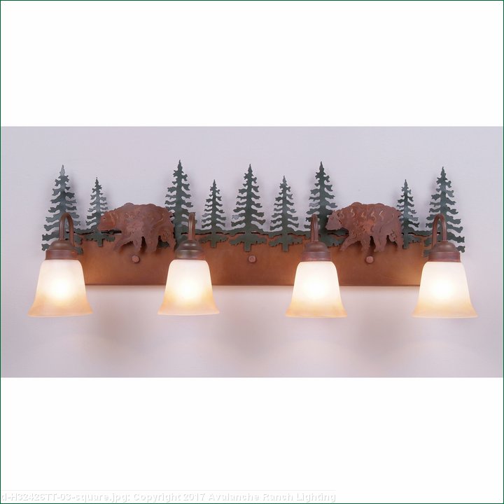 Affordable and pratical bathroom lights make the Wasatch Bathroom Vanity lights one of our best selling series. Offered with a choice of eight different styles and colors of glass globes, this fixture gives abundant light and rustic character to any bathroom. This item is the Wasatch Quad - Bear and is Pictured in Finish #03 - Cedar Green stain with Rust Patina trees.