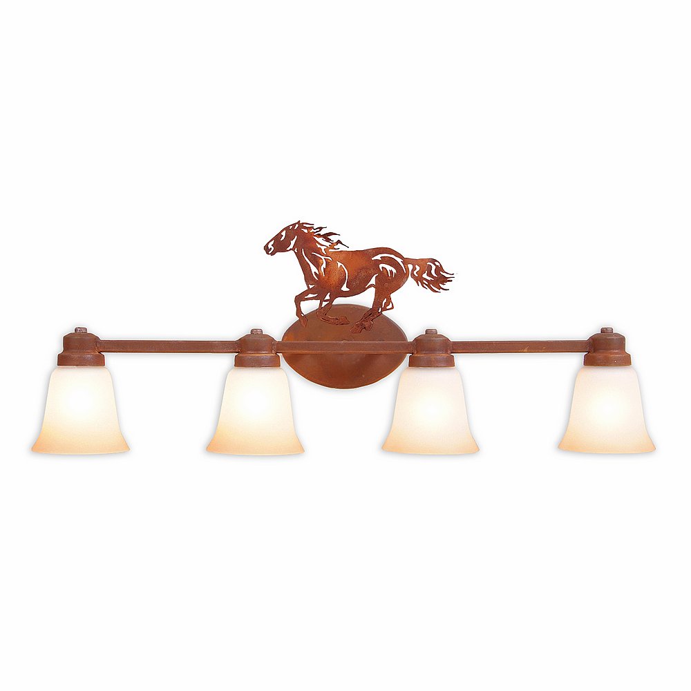 The Sienna Quad Bath Light - Horse light features an image of a horse atop glass bells with a choice of seven different colors hanging from cups attached to square tubes. This light is ideal for anyone looking to add a touch of wildlife or warm rustic character to their bathroom lighting.