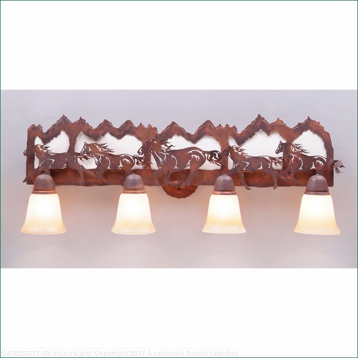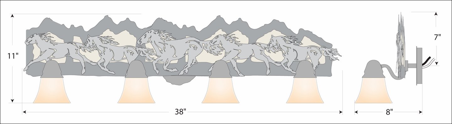 The Lakeside Quad Bath Light - Horse/Mtn features mountains backed with handmade bark paper and our laser cut horses running along the front. There is a choice of six different glass globes, the smallest of which only takes A15 bulb. This rustic bathroom vanity light will add warm lighting and rustic character to any bathroom, hallway or over a kitchen sink. Note: This fixture was redesigned in March 2010.
