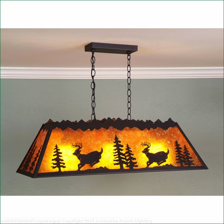 The Rocky Mtn Small Billiard Light - Mtn Deer is a 15in. by 36in. rectangular frame that features our exclusive deer and spruce tree metal artwork on all four panels. With three downlights, this fixture will provide excellent light for a small billiard table, island eating area, or other similar locations. Each downlight has a white, matte glass shade covering the bulb. For the shade material around the outside, choose between Almond or Amber mica. Included is a rectangular ceiling canopy in a matching finish, an extra 10 feet of wire, and 6 feet of chain (for a 3 foot drop). While the fixture is shown at a 26in. height, it can be shortened, or dropped lower if you purchase additional chain. Hardwire is standard. This light will bring rustic lighting to any log home, cabin, or northwood billiard room.