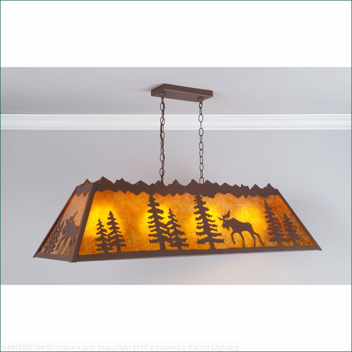 The Rocky Mtn Island Large Billiard Light - Mtn Moose is an 18in. by 48in. rectangular frame that features our exclusive moose and spruce tree metal artwork on all four panels. With four downlights, this fixture will provide excellent light for a regulation-sized billiard table, island eating area, or other similar locations. Each downlight has a white, matte glass shade covering the bulb. For the shade material around the outside, choose between Almond or Amber mica. Included is a rectangular ceiling canopy in a matching finish, an extra 10 feet of wire, and 6 feet of chain (for a 3 foot drop). While the fixture is shown at a 26in. height, it can be shortened, or dropped lower if you purchase additional chain. Hardwire is standard. This light will bring rustic lighting to any log home, cabin, or northwood billiard room.