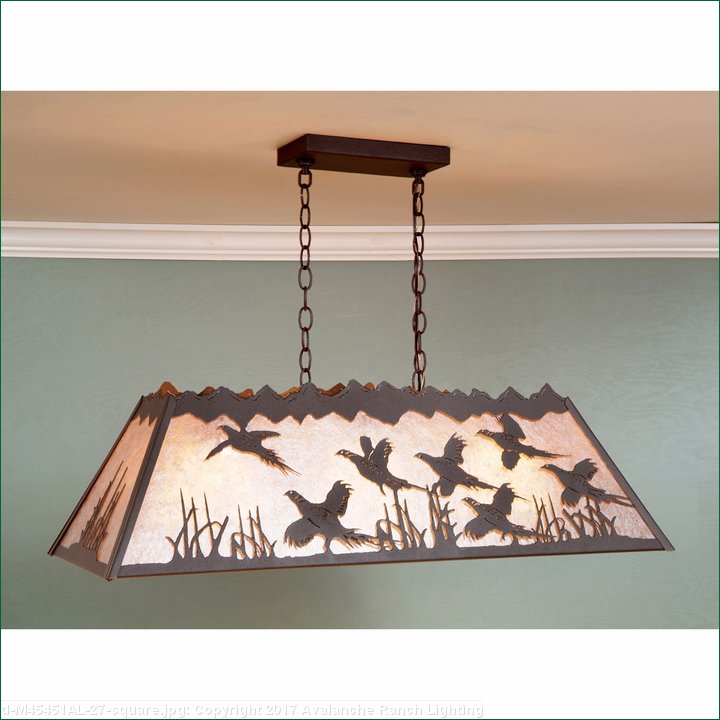 The Rocky Mtn Small Billiard Light - Pheasant is a 15in. by 36in. rectangular frame that features our exclusive pheasant and cattail metal artwork on all four panels. With three downlights, this fixture will provide excellent light for a small billiard table, island eating area, or other similar locations. Each downlight has a white, matte glass shade covering the bulb. For the shade material around the outside, choose between Almond or Amber mica. Included is a rectangular ceiling canopy in a matching finish, an extra 10 feet of wire, and 6 feet of chain (for a 3 foot drop). While the fixture is shown at a 26in. height, it can be shortened, or dropped lower if you purchase additional chain. Hardwire is standard. This light will bring rustic lighting to any log home, cabin, or northwood billiard room.