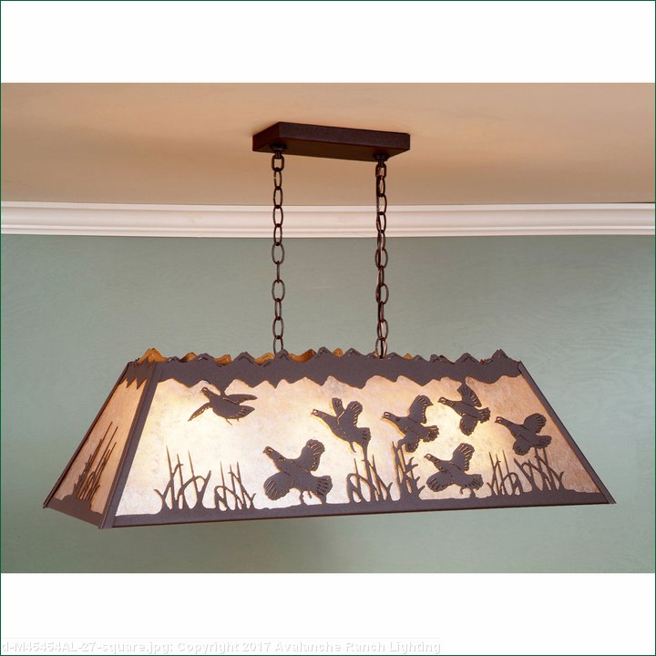 The Rocky Mtn Small Billiard Light -Quail is a 15in. by 36in. rectangular frame that features our exclusive quail and cattail metal artwork on all four panels. With three downlights, this fixture will provide excellent light for a small billiard table, island eating area, or other similar locations. Each downlight has a white, matte glass shade covering the bulb. For the shade material around the outside, choose between Almond or Amber mica. Included is a rectangular ceiling canopy in a matching finish, an extra 10 feet of wire, and 6 feet of chain (for a 3 foot drop). While the fixture is shown at a 26in. height, it can be shortened, or dropped lower if you purchase additional chain. Hardwire is standard. This light will bring rustic lighting to any log home, cabin, or northwood billiard room.