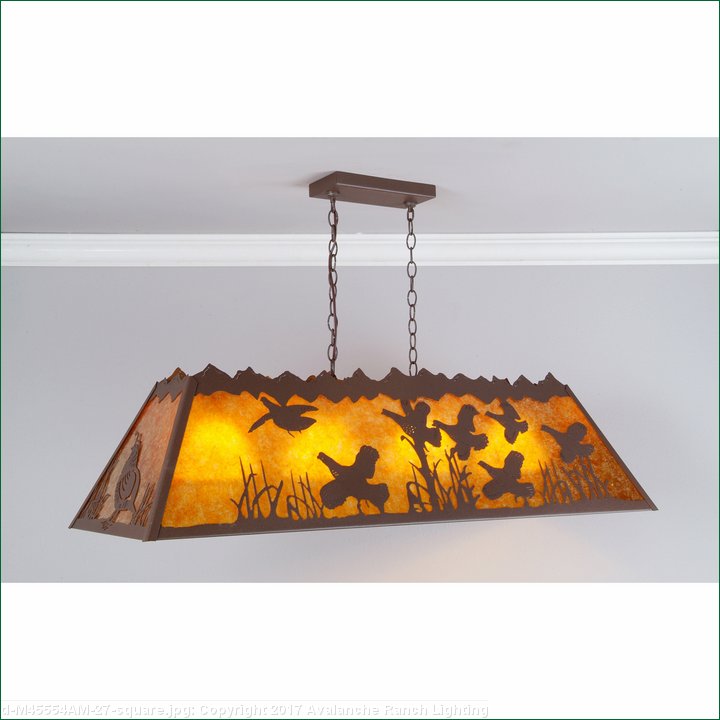 The Rocky Mtn Island Large Billiard Light - Quail is an 18in. by 48in. rectangular frame that features our exclusive quail and cattail metal artwork on all four panels. With four downlights, this fixture will provide excellent light for a regulation-sized billiard table, island eating area, or other similar locations. Each downlight has a white, matte glass shade covering the bulb. For the shade material around the outside, choose between Almond or Amber mica. Included is a rectangular ceiling canopy in a matching finish, an extra 10 feet of wire, and 6 feet of chain (for a 3 foot drop). While the fixture is shown at a 26in. height, it can be shortened, or dropped lower if you purchase additional chain. Hardwire is standard. This light will bring rustic lighting to any log home, cabin, or northwood billiard room.