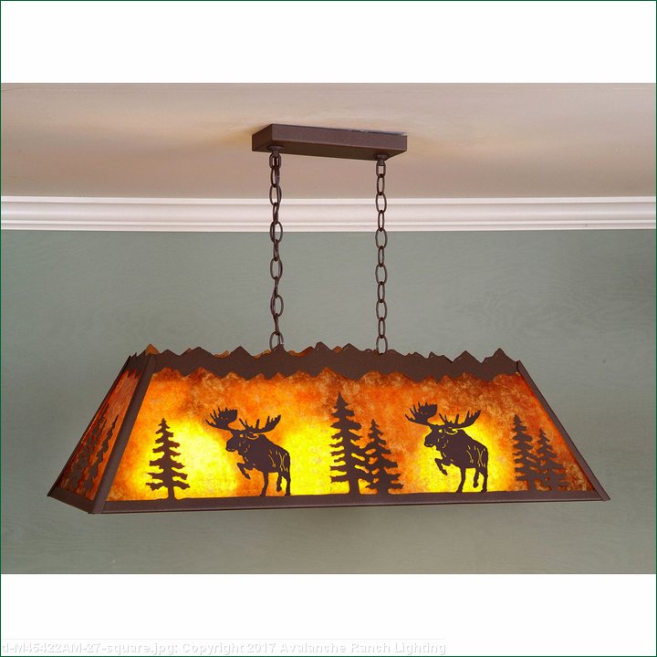 The Rocky Mtn Small Billiard Light - Alaska Moose is a 15in. by 36in. rectangular frame that features our exclusive moose and spruce tree metal artwork on all four panels. With three downlights, this fixture will provide excellent light for a small billiard table, island eating area, or other similar locations. Each downlight has a white, matte glass shade covering the bulb. For the shade material around the outside, choose between Almond or Amber mica. Included is a rectangular ceiling canopy in a matching finish, an extra 10 feet of wire, and 6 feet of chain (for a 3 foot drop). While the fixture is shown at a 26in. height, it can be shortened, or dropped lower if you purchase additional chain. Hardwire is standard. This light will bring rustic lighting to any log home, cabin, or northwood billiard room.