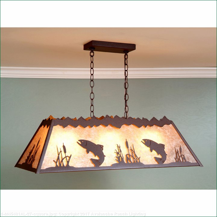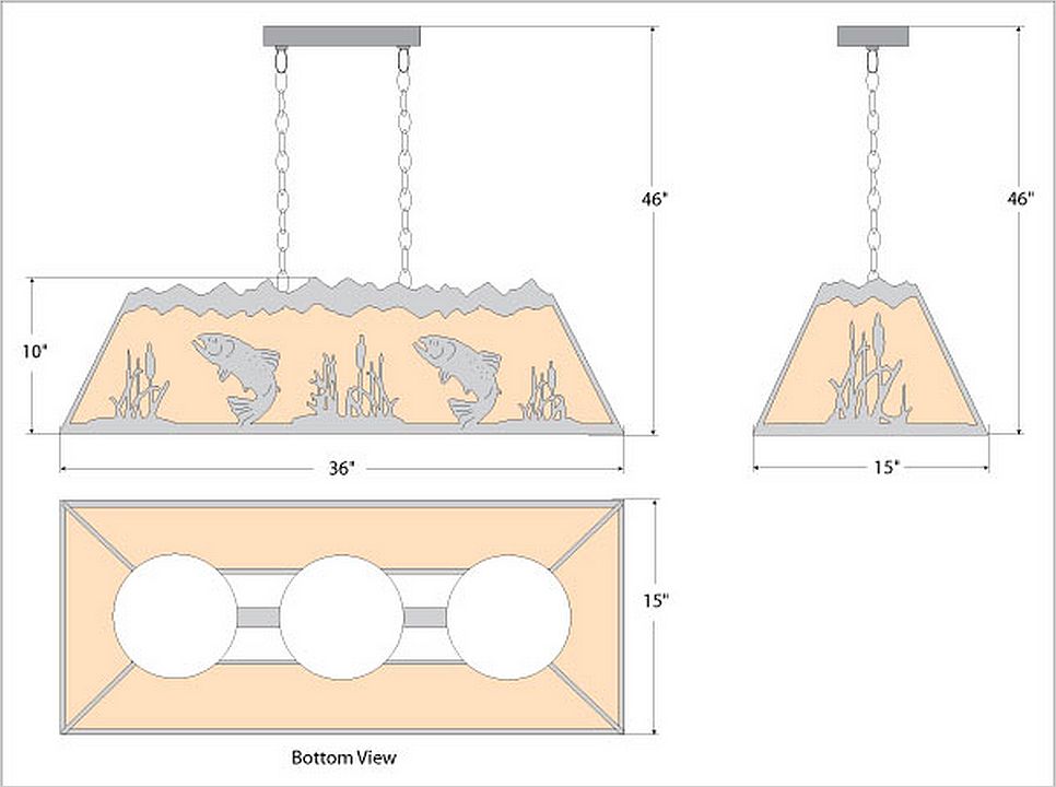 The Rocky Mtn Small Billiard Light - Trout is a 15in. by 36in. rectangular frame that features our exclusive trout and cattail metal artwork on all four panels. With three downlights, this fixture will provide excellent light for a small billiard table, island eating area, or other similar locations. Each downlight has a white, matte glass shade covering the bulb. For the shade material around the outside, choose between Almond or Amber mica. Included is a rectangular ceiling canopy in a matching finish, an extra 10 feet of wire, and 6 feet of chain (for a 3 foot drop). While the fixture is shown at a 26in. height, it can be shortened, or dropped lower if you purchase additional chain. Hardwire is standard. This light will bring rustic lighting to any log home, cabin, or northwood billiard room.