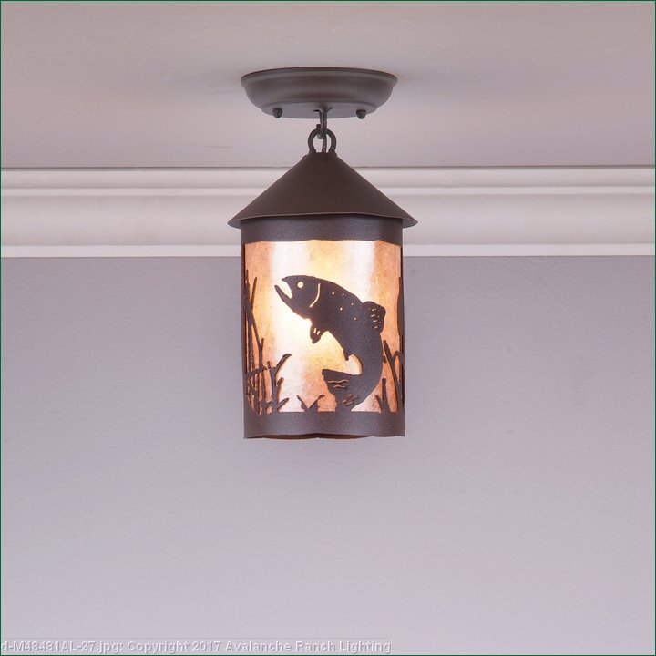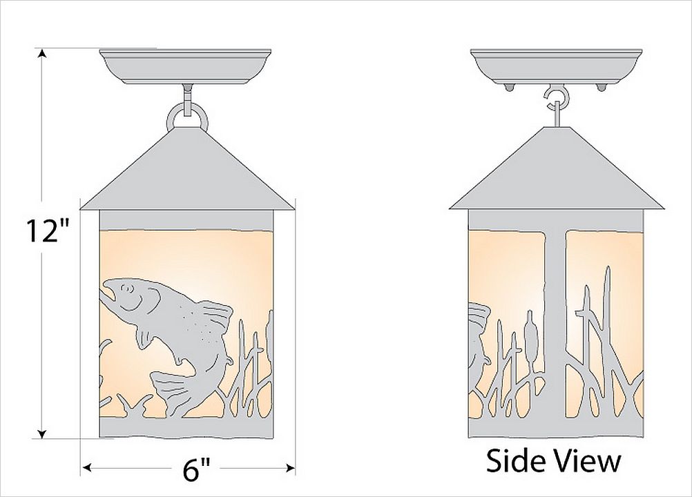 The Cascade Close-to-Ceiling Light Small - Trout features a 4 inch round cylinder with a cone top and a shade diffuser choice of color between Almond or Amber mica. It has a trout and cattails metal art on the front and back and solid bands on either side of the cylinder. Attaches to ceiling with a round ceiling canopy. Suitable for interior and damp locations only. This rustic ceiling light is ideal for bringing rustic lighting to any log home, cabin or northwood lodge-themed room.