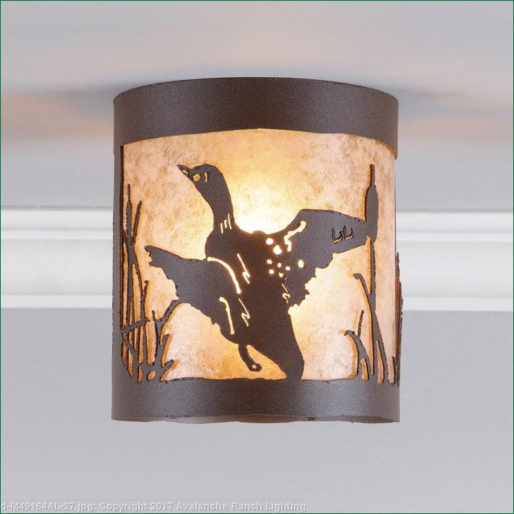The Kincaid Drum Ceiling Light Small - Loon features a 7 inch round cylinder with a shade diffuser choice of color between Almond or Amber mica. It has a loon and cattails metal art on the front and back and solid bands on either side of the cylinder. Attaches to ceiling with a round ceiling canopy. Suitable for interior and damp locations only. This rustic ceiling light is ideal for bringing rustic lighting to any log home, cabin or northwood lodge-themed room.
