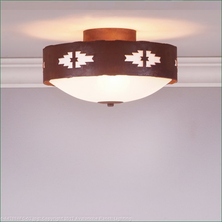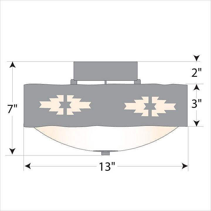 Our Ridgemont Close-to-Ceiling Medium - Pueblo measures 13 inches in diameter and 7 inches high and features our exclusive southwest pueblo art cutouts around the circumference of a steel band. Behind each cutout is a diffuser panel. The frosted glass bottom bowl detaches for bulb changing. For an unique addition to your rustic ceiling light, order one of the decorative Bottom Kits: a three-tree, 3D Spruce Cone or a 3D Pine Cone, any which can be ordered in the same or different color as the fixture. This item is ideal for anyone looking for a non-hanging light to add rustic, Southwestern character to their log home, cabin or northwood lodge-themed room.