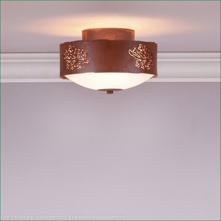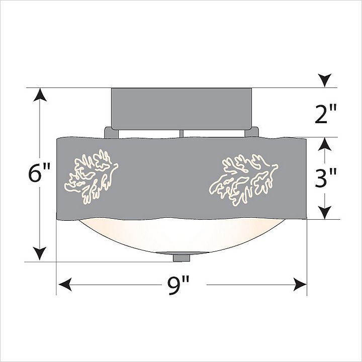 Our Ridgemont Close-to-Ceiling Small - Cedar Bough Cutout measures 9 inches in diameter and 6 inches high and features our exclusive cedar bough art cutouts around the circumference of a steel band. Behind each cutout is a diffuser panel. The frosted glass bottom bowl detaches for bulb changing. For an unique addition to your rustic ceiling light, order one of the decorative Bottom Kits: a three-tree, 3D Spruce Cone or a 3D Pine Cone, any which can be ordered in the same or different color as the fixture. This item is ideal for anyone looking for a non-hanging light to add rustic, forest-inspired character to their log home, cabin or northwood lodge-themed room.