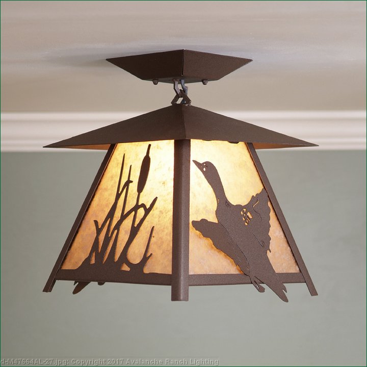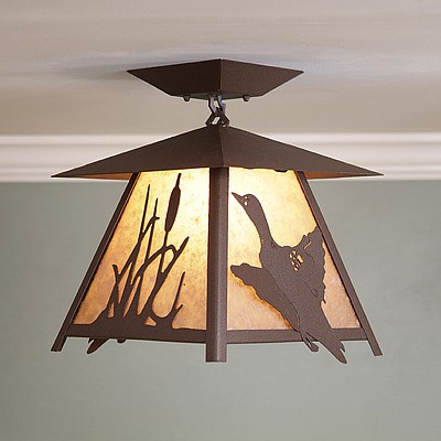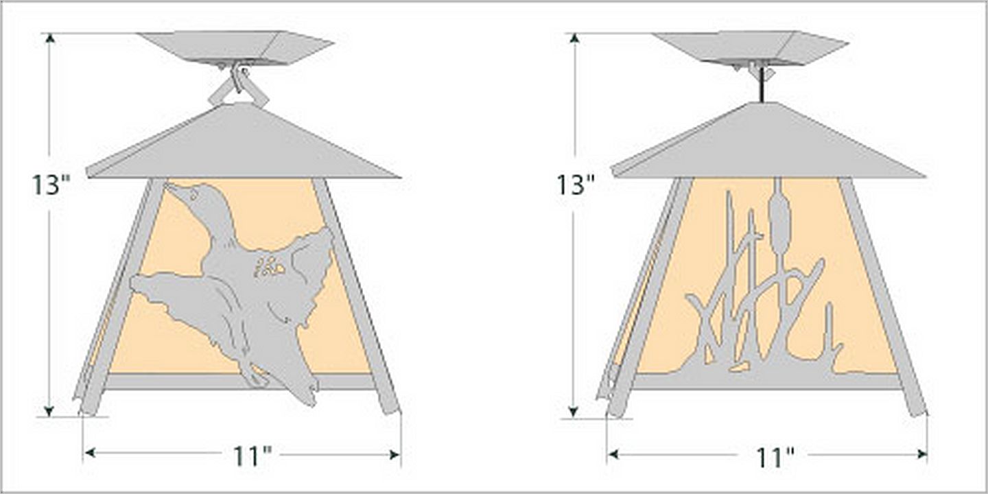 The Smoky Mtn Ceiling Light Large- Loon features a loon image on the two front panels, along with cattail images on the side panels. The lantern also comes with a diffuser material choice between Almond or Amber mica. This fixture attaches to the ceiling with a square ceiling canopy, and is suitable for interior and damp locations only. This light will bring rustic lighting to any log home, cabin or northwood lodge-themed room.