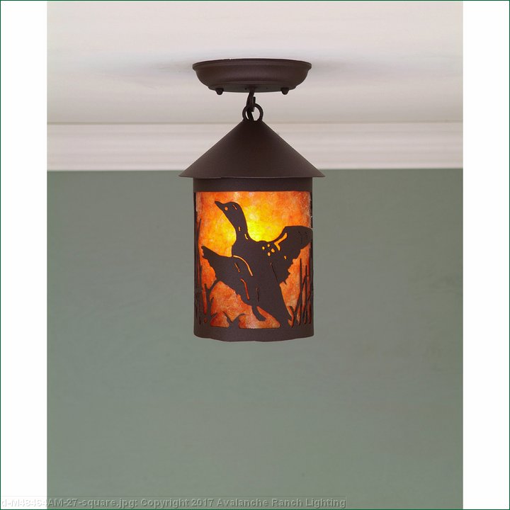 The Cascade Close-to-Ceiling Light Small - Loon features a 4 inch round cylinder with a cone top and a shade diffuser choice of color between Almond or Amber mica. It has a loon and cattails metal art on the front and back and solid bands on either side of the cylinder. Attaches to ceiling with a round ceiling canopy. Suitable for interior and damp locations only. This rustic ceiling light is ideal for bringing rustic lighting to any log home, cabin or northwood lodge-themed room.