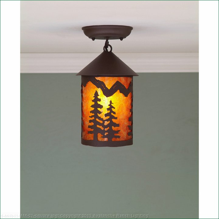 The Cascade Close-to-Ceiling Light Small - Spruce Tree features a 4 inch round cylinder with a cone top and a shade diffuser choice of color between Almond or Amber mica. It has a twin spruce metal art image on the front and back and spruce trees on either side of the cylinder. Attaches to ceiling with a round ceiling canopy. Suitable for interior and damp locations only. This light is ideal for bringing rustic lighting to any log home, cabin or northwood lodge-themed room.