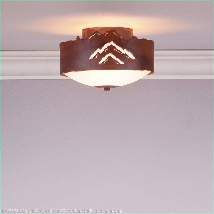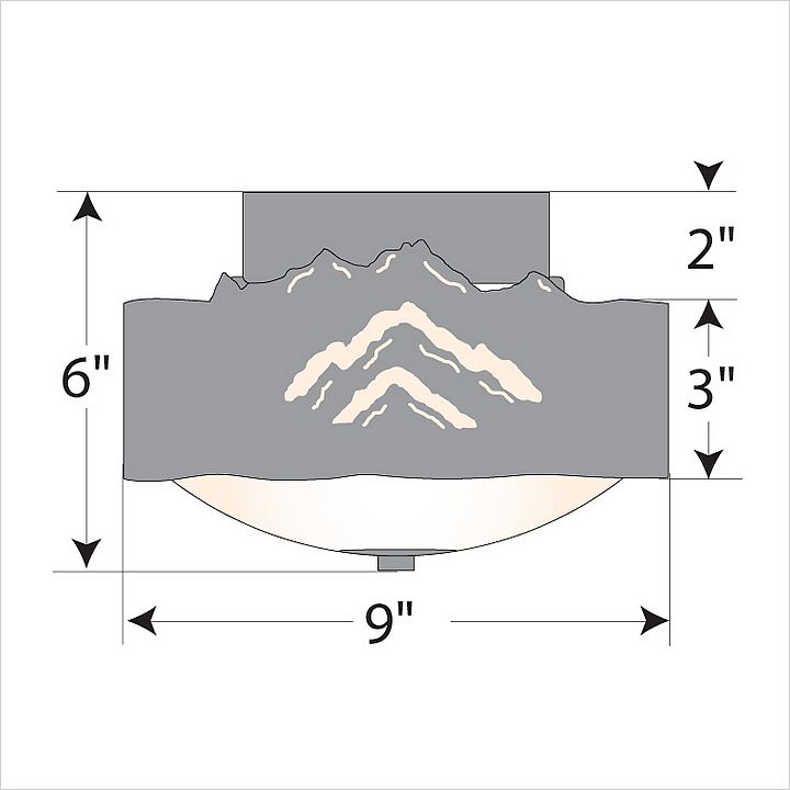 Our Ridgemont Close-to-Ceiling Small - Mountain Cutout measures 9 inches in diameter and 6 inches high and features our exclusive mountain art cutouts around the circumference of a steel band. Behind each cutout is a diffuser panel. The frosted glass bottom bowl detaches for bulb changing. For an unique addition to your rustic ceiling light, order one of the decorative Bottom Kits: a three-tree, 3D Spruce Cone or a 3D Pine Cone, any which can be ordered in the same or different color as the fixture. This item is ideal for anyone looking for a non-hanging light to add rustic, forest-inspired character to their log home, cabin or northwood lodge-themed room.