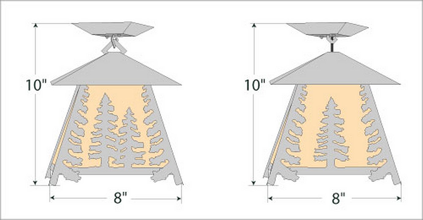 The Smoky Mtn Ceiling Light Small - Spruce features a single spruce image on each side panel, with a double spruce tree image on the front panels. The lantern also comes with a diffuser material choice between Almond or Amber mica. This fixture attaches to the ceiling with a square ceiling canopy, and is suitable for interior and damp locations only. This light will bring rustic lighting to any log home, cabin or northwood lodge-themed room.