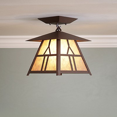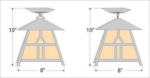 The Smoky Mtn Ceiling Light Small - Westhill features our exclusive mission-style artwork on all four panels. The lantern also comes with a diffuser material choice between Almond or Amber mica. This fixture attaches to the ceiling with a square ceiling canopy, and is suitable for interior and damp locations only. This Mission-style ceiling fixture will bring warm lighting and character to any cottage, home, or craftsman-styled room.