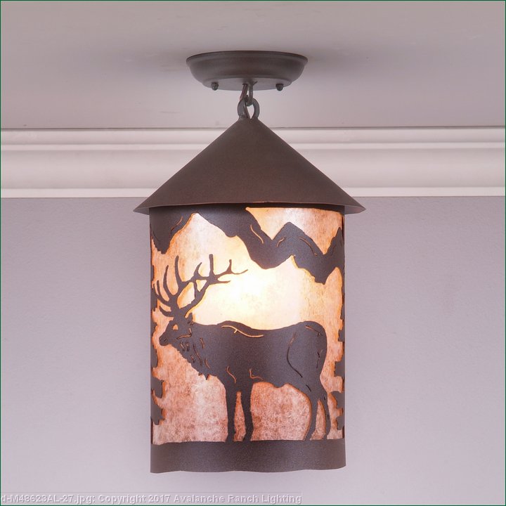 The Cascade Close-to-Ceiling Light Large - Valley Elk features a 8 inch round cylinder with a cone top and a shade diffuser choice of color between Almond or Amber mica. It has a elk metal art image on the front and back and spruce trees on either side of the cylinder. Attaches to ceiling with a round ceiling canopy. Suitable for interior and damp locations only. This light is ideal for bringing rustic lighting to any log home, cabin or northwood lodge-themed room.