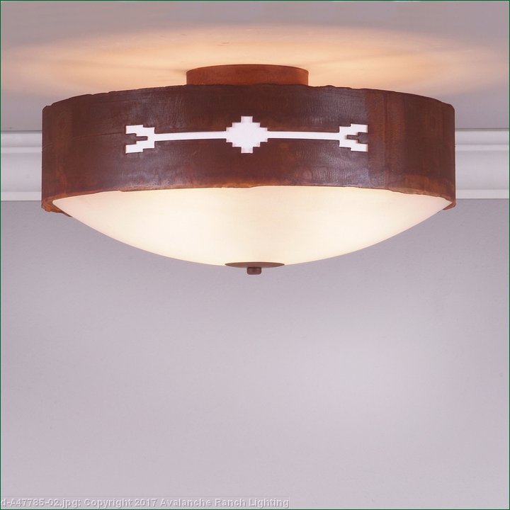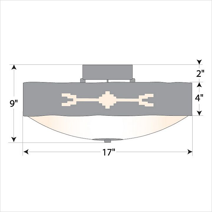 Our Ridgemont Close-to-Ceiling Large - Del Rio measures 17 inches in diameter and 8 inches high and features our exclusive southwest del rio art cutouts around the circumference of a steel band. Behind each cutout is a diffuser panel. The frosted glass bottom bowl detaches for bulb changing. For an unique addition to your rustic ceiling light, order one of the decorative Bottom Kits: a three-tree, 3D Spruce Cone or a 3D Pine Cone, any which can be ordered in the same or different color as the fixture. This item is ideal for anyone looking for a non-hanging light to add rustic, Southwestern character to their log home, cabin or northwood lodge-themed room.
