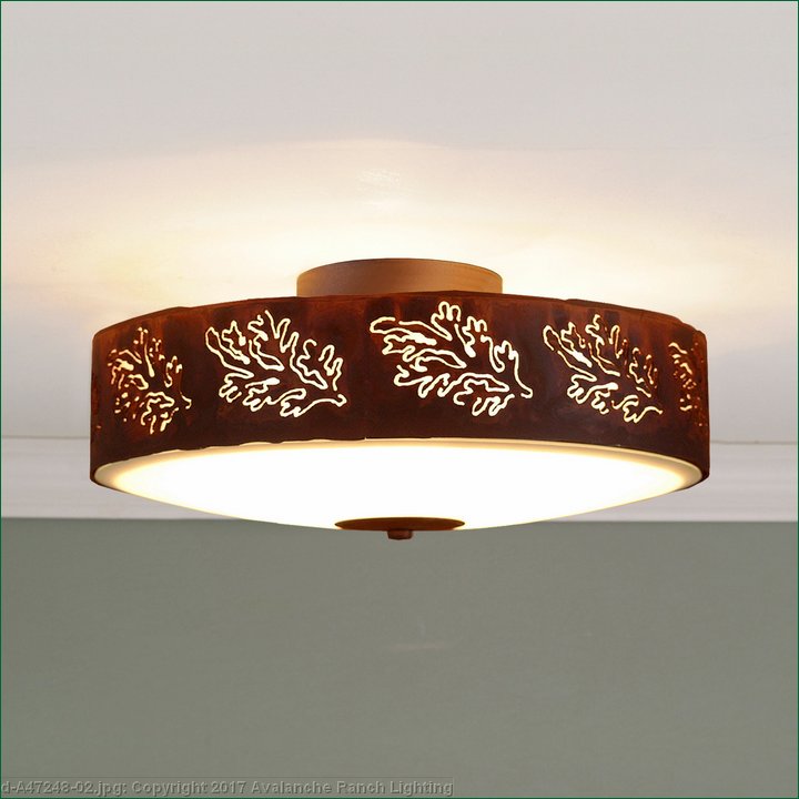 Our Ridgewood Close-to-Ceiling Large - Cedar Bough Cutout measures 15 inches in diameter and 6 inches high and features our exclusive cedar bough art cutouts around the circumference of a steel band. Behind each cutout is a diffuser panel. The frosted glass bottom bowl detaches for bulb changing. For an unique addition to your rustic ceiling light, order one of the decorative Bottom Kits: a three-tree, 3D Spruce Cone or a 3D Pine Cone, any which can be ordered in the same or different color as the fixture. This item is ideal for anyone looking for a non-hanging light to add rustic, forest-inspired character to their log home, cabin or northwood lodge-themed room.