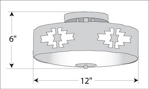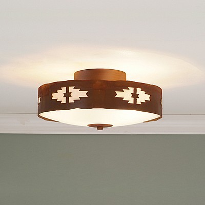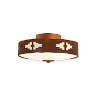 Our Ridgewood Close-to-Ceiling Small - Pueblo measures 12 inches in diameter and 5 inches high and features our exclusive southwest pueblo art cutouts around the circumference of a steel band. Behind each cutout is a diffuser panel. The frosted glass bottom bowl detaches for bulb changing. For an unique addition to your rustic ceiling light, order one of the decorative Bottom Kits: a three-tree, 3D Spruce Cone or a 3D Pine Cone, any which can be ordered in the same or different color as the fixture. This item is ideal for anyone looking for a non-hanging light to add rustic, Southwestern character to their log home, cabin or northwood lodge-themed room.