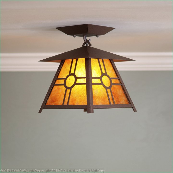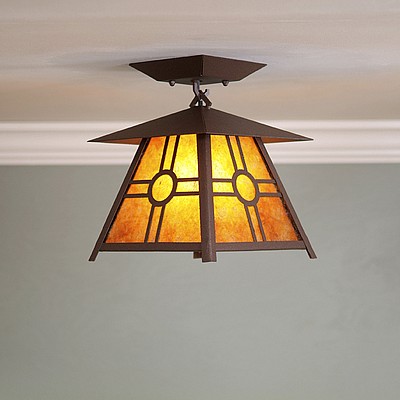 The Smoky Mtn Ceiling Light Small - features our exclusive mission-style artwork on all four panels. The lantern also comes with a diffuser material choice between Almond or Amber mica. This fixture attaches to the ceiling with a square ceiling canopy, and is suitable for interior and damp locations only. This Mission-style ceiling fixture will bring warm lighting and character to any cottage, home, or craftsman-styled room.