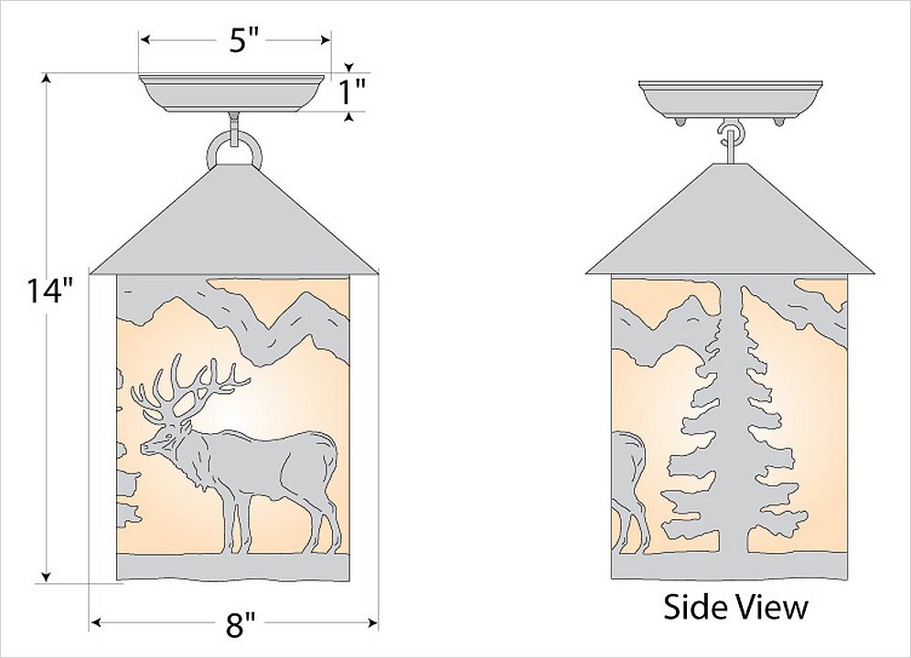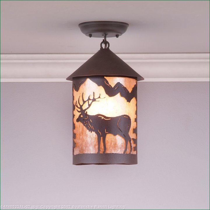 The Cascade Close-to-Ceiling Light Medium - Valley Elk features a 6 inch round cylinder with a cone top and a shade diffuser choice of color between Almond or Amber mica. It has a elk metal art image on the front and back and spruce trees on either side of the cylinder. Attaches to ceiling with a round ceiling canopy. Suitable for interior and damp locations only. This light is ideal for bringing rustic lighting to any log home, cabin or northwood lodge-themed room.