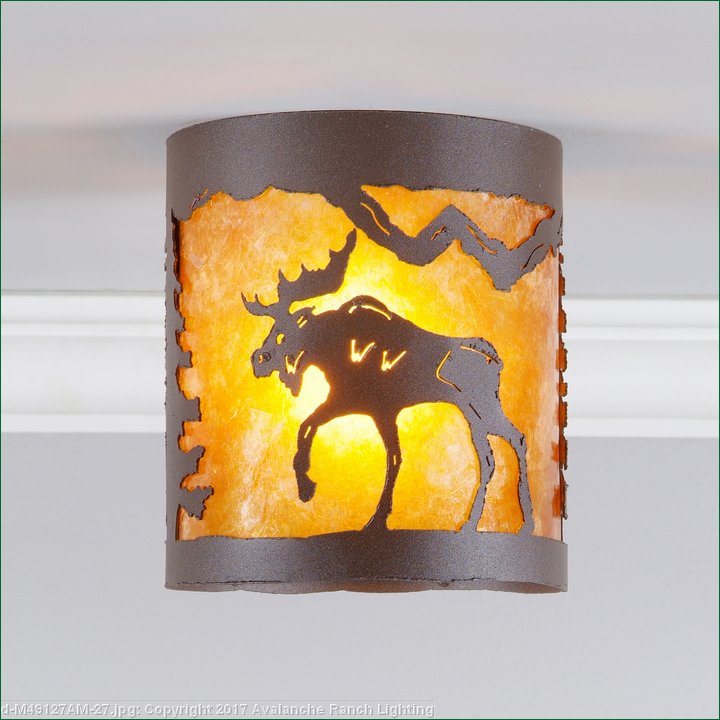The Kincaid Drum Ceiling Light Small - Mtn Moose features a 7 inch round cylinder with a shade diffuser choice of color between Almond or Amber mica. It has a moose metal art image on the front and back and spruce trees on either side of the cylinder. Attaches to ceiling with a round ceiling canopy. Suitable for interior and damp locations only. This rustic ceiling light is ideal for bringing rustic lighting to any log home, cabin or northwood lodge-themed room.