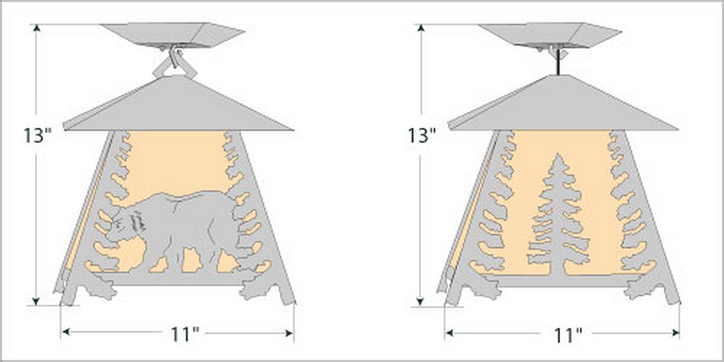 The Smoky Mtn Ceiling Light Large - Bear features a bear image on the two front panels, along with a single spruce tree on the side panels. The lantern also comes with a diffuser material choice between Almond or Amber mica. This fixture attaches to the ceiling with a square ceiling canopy, and is suitable for interior and damp locations only. This light will bring rustic lighting to any log home, cabin or northwood lodge-themed room.