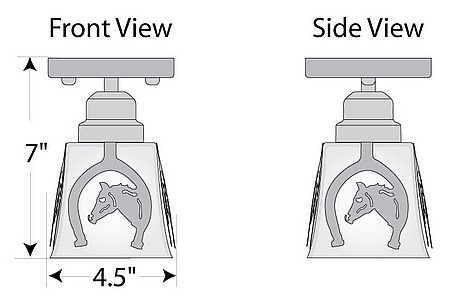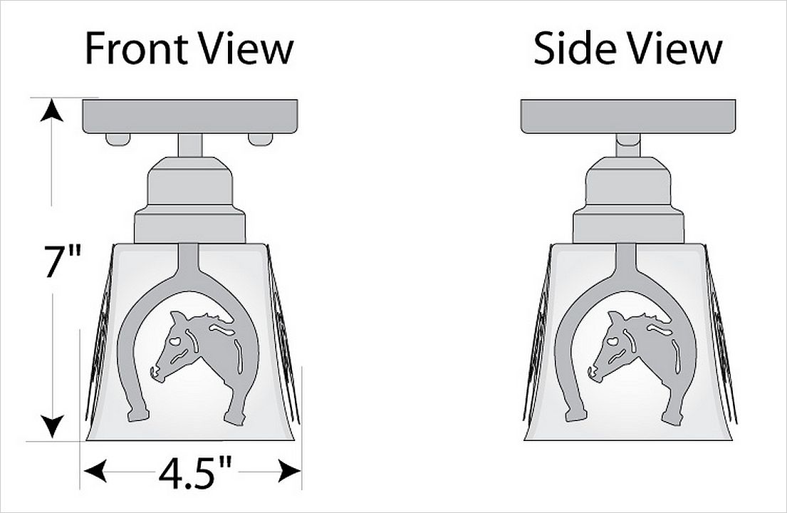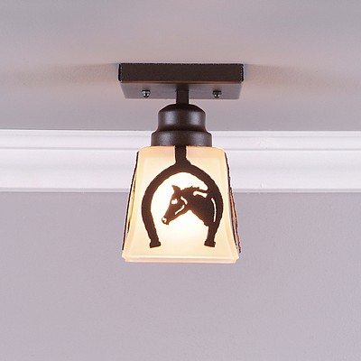 The Woodland Ceiling Light Single - Horse Horseshoe features square mission style glass and simple horse designs surrounding the glass. The horse heads have hand-cut interior lines which gives each image a unique look. Choice of glass color between Frost Clear and Tea-Stained. This sophisticated take on traditional rustic lighting will generate a warm atmosphere in any hallway or entry way.