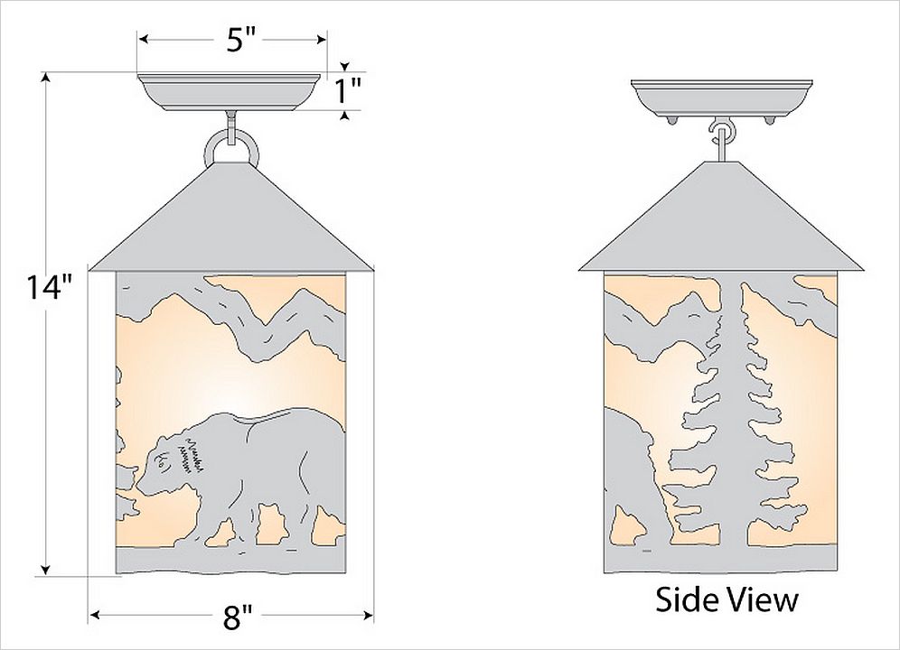 The Cascade Close-to-Ceiling Light Medium - Bear features a 6 inch round cylinder with a cone top and a shade diffuser choice of color between Almond or Amber mica. It has a bear metal art image on the front and back and spruce trees on either side of the cylinder. Attaches to ceiling with a round ceiling canopy. Suitable for interior and damp locations only. This rustic ceiling light is ideal for bringing rustic lighting to any log home, cabin or northwood lodge-themed room.