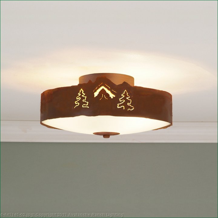 Our Ridgewood Close-to-Ceiling Small - Mountain/Pine Cutout measures 12 inches in diameter and 5 inches high and features our exclusive mountain and pine art cutouts around the circumference of a steel band. Behind each cutout is a diffuser panel. The frosted glass bottom bowl detaches for bulb changing. For an unique addition to your rustic ceiling light, order one of the decorative Bottom Kits: a three-tree, 3D Spruce Cone or a 3D Pine Cone, any which can be ordered in the same or different color as the fixture. This item is ideal for anyone looking for a non-hanging light to add rustic, forest-inspired character to their log home, cabin or northwood lodge-themed room.