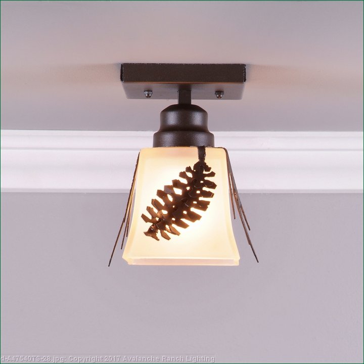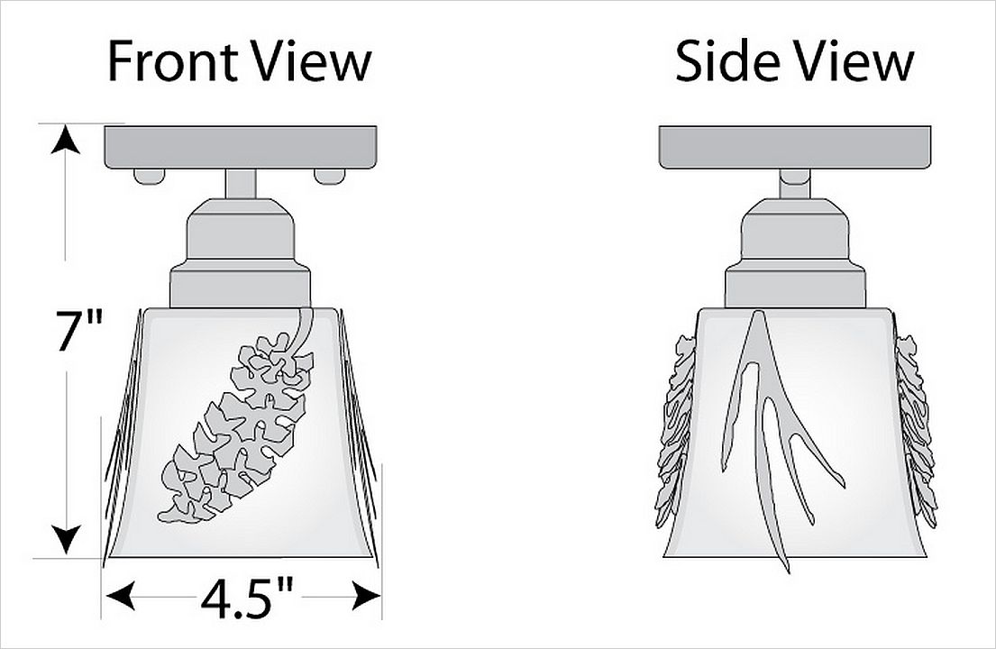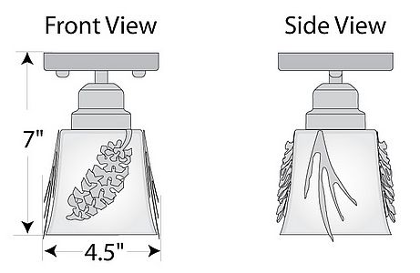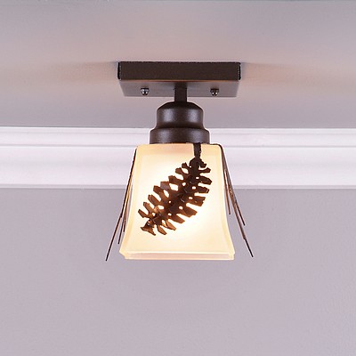 The Woodland Ceiling Light Single - Spruce Cone features square mission style glass and three dimensional spruce cone designs surrounding the glass. The cones are handmade which gives each image a unique look. Choice of glass color between Frost Clear and Tea-Stained. This sophisticated take on traditional rustic lighting will generate a warm atmosphere in any hallway or entry way.