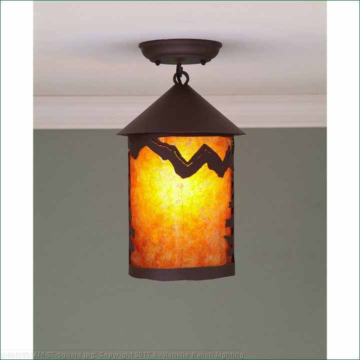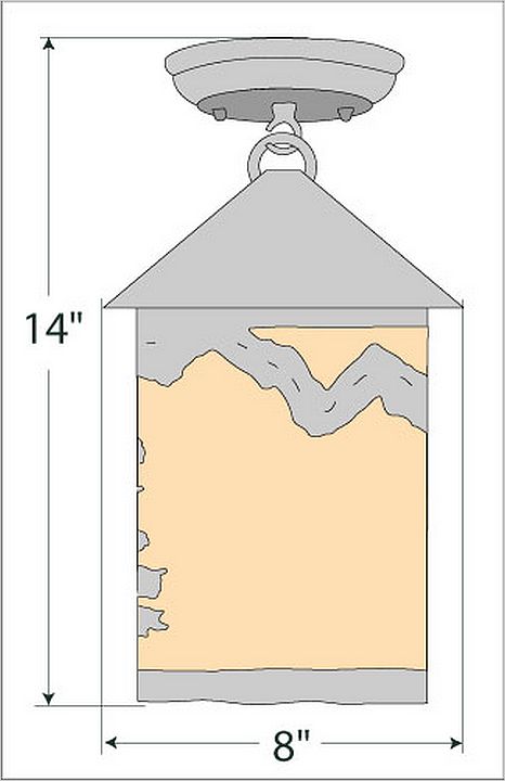 The Cascade Close-to-Ceiling Light Medium - Rustic Plain features a 6 inch round cylinder with a cone top and shade diffuser choice of color between Almond or Amber mica. It has mountains on the front and back and spruce trees on either side of the cylinder. Attaches to ceiling with a round ceiling canopy. Suitable for interior and damp locations only. This light is ideal for bringing rustic lighting to any log home, cabin or northwood lodge-themed room.