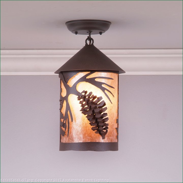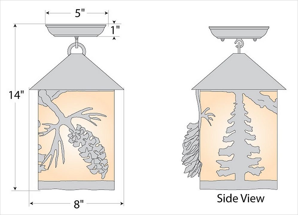 The Cascade Close-to-Ceiling Light Medium - Spruce Cone features a 6 inch round cylinder with a cone top and a shade diffuser choice of color between Almond or Amber mica. It has a three dimensional spruce cone metal art image on the front and back and spruce trees on either side of the cylinder. Attaches to ceiling with a round ceiling canopy. Suitable for interior and damp locations only. This rustic ceiling light is ideal for bringing rustic westeern lighting to any log home, cabin or northwood lodge-themed room.