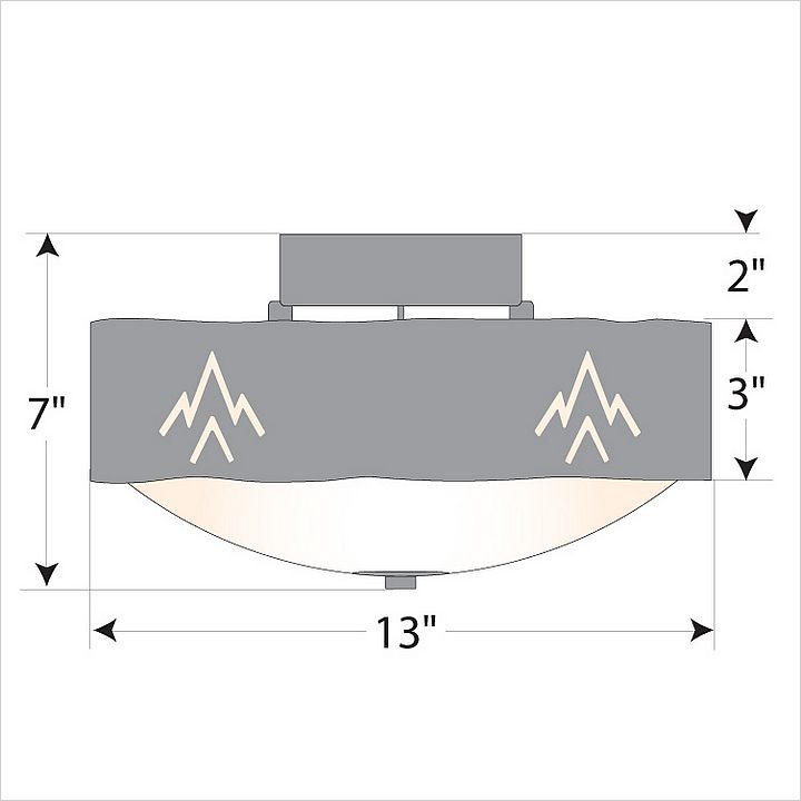Ridgemont Close-to-Ceiling Medium - Deception Pass measures 13 inches in diameter and 7 inches high and features our exclusive southwest art cutouts around the circumference of a steel band. Behind each cutout is a diffuser panel. The frosted glass bottom bowl detaches for bulb changing. For an unique addition to your rustic ceiling light, order one of the decorative Bottom Kits: a three-tree, 3D Spruce Cone or a 3D Pine Cone, any which can be ordered in the same or different color as the fixture. This item is ideal for anyone looking for a non-hanging light to add rustic, Southwestern character to their log home, cabin or northwood lodge-themed room.