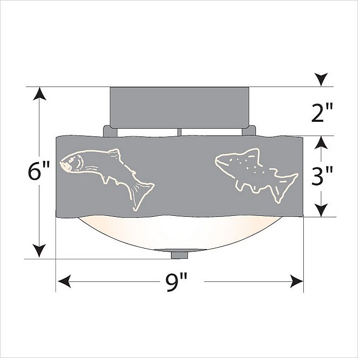Our Ridgemont Close-to-Ceiling Small - Fish Cutout measures 9 inches in diameter and 6 inches high and features our exclusive salmon and trout art cutouts around the circumference of a steel band. Behind each cutout is a diffuser panel. The frosted glass bottom bowl detaches for bulb changing. For an unique addition to your rustic ceiling light, order one of the decorative Bottom Kits: a three-tree, 3D Spruce Cone or a 3D Pine Cone, any which can be ordered in the same or different color as the fixture. This item is ideal for anyone looking for a non-hanging light to add rustic, forest-inspired character to their log home, cabin or northwood lodge-themed room.
