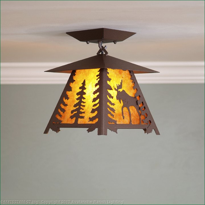 The Smoky Mtn Ceiling Light Small - Moose features a moose image on the two front panels, along with a single spruce tree on the side panels. The lantern also comes with a diffuser material choice between Almond or Amber mica. This fixture attaches to the ceiling with a square ceiling canopy, and is suitable for interior and damp locations only. This light will bring rustic lighting to any log home, cabin or northwood lodge-themed room.