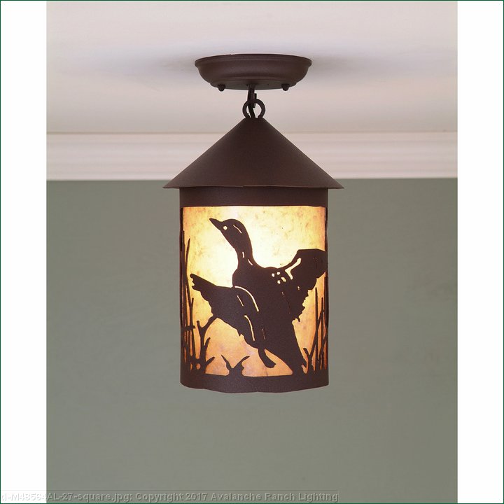 The Cascade Close-to-Ceiling Light Medium - Loon features a 6 inch round cylinder with a cone top and a shade diffuser choice of color between Almond or Amber mica. It has a loon and cattails metal art on the front and back and solid bands on either side of the cylinder. Attaches to ceiling with a round ceiling canopy. Suitable for interior and damp locations only. This rustic ceiling light is ideal for bringing rustic lighting to any log home, cabin or northwood lodge-themed room.