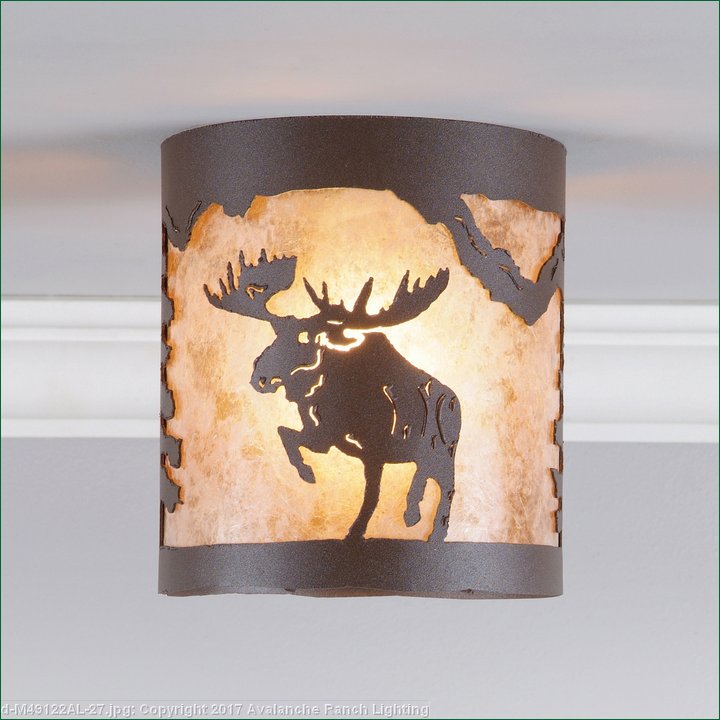 The Kincaid Drum Ceiling Light Small - Alaska Moose features a 7 inch round cylinder and a shade diffuser choice of color between Almond or Amber mica. It has a moose metal art image on the front and back and spruce trees on either side of the cylinder. Attaches to ceiling with a round ceiling canopy. Suitable for interior and damp locations only. This light is ideal for bringing rustic lighting to any log home, cabin or northwood lodge-themed room.