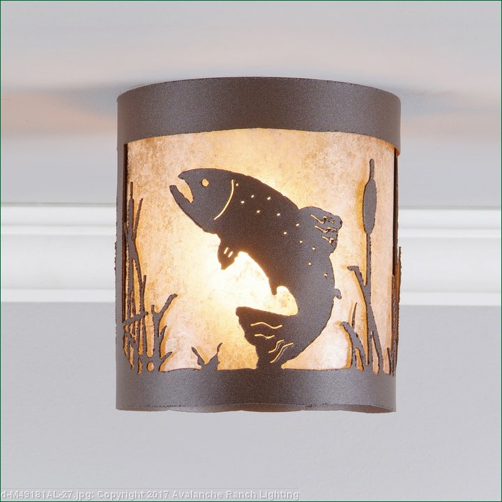 The Kincaid Drum Ceiling Light Small - Trout features a 7 inch round cylinder with a shade diffuser choice of color between Almond or Amber mica. It has a trout and cattails metal art on the front and back and solid bands on either side of the cylinder. Attaches to ceiling with a round ceiling canopy. Suitable for interior and damp locations only. This rustic ceiling light is ideal for bringing rustic lighting to any log home, cabin or northwood lodge-themed room.