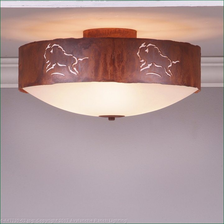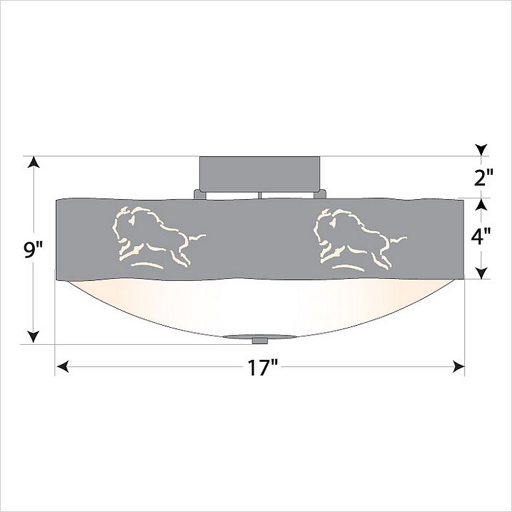Our Ridgemont Close-to-Ceiling Large - Bison measures 17 inches in diameter and 8 inches high and features our exclusive southwest bison art cutouts around the circumference of a steel band. Behind each cutout is a diffuser panel. The frosted glass bottom bowl detaches for bulb changing. For an unique addition to your rustic ceiling light, order one of the decorative Bottom Kits: a three-tree, 3D Spruce Cone or a 3D Pine Cone, any which can be ordered in the same or different color as the fixture. This item is ideal for anyone looking for a non-hanging light to add rustic, Southwestern character to their log home, cabin or northwood lodge-themed room.